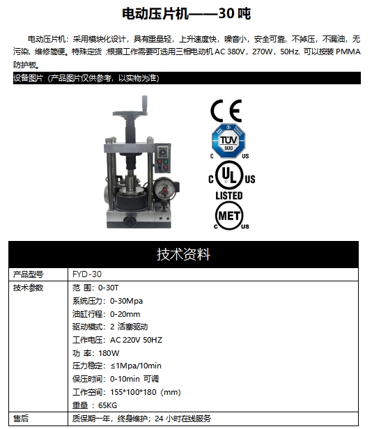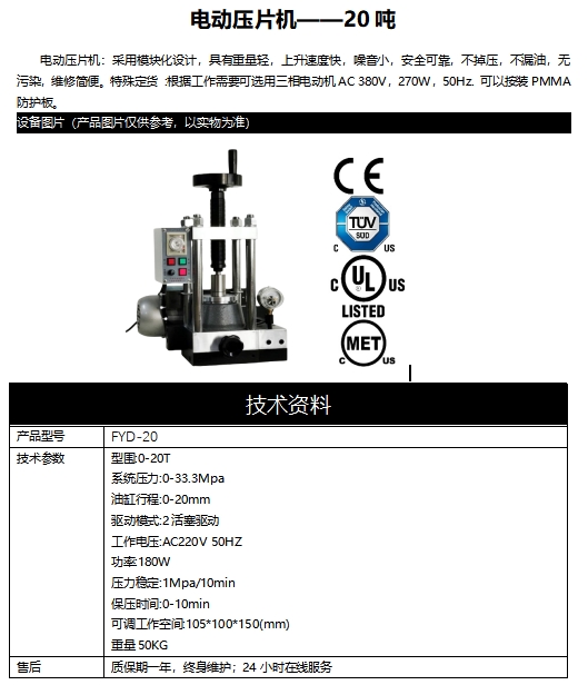 電動壓片機:采用模塊化設計,具有重量輕,上升速度快,噪音小,安全可靠,不掉壓,不漏油,無污染,維修簡便。特殊定貨 :根據工作需要可選用三相電動機AC 380V,270W,50Hz. 可以按裝PMMA防護板。
